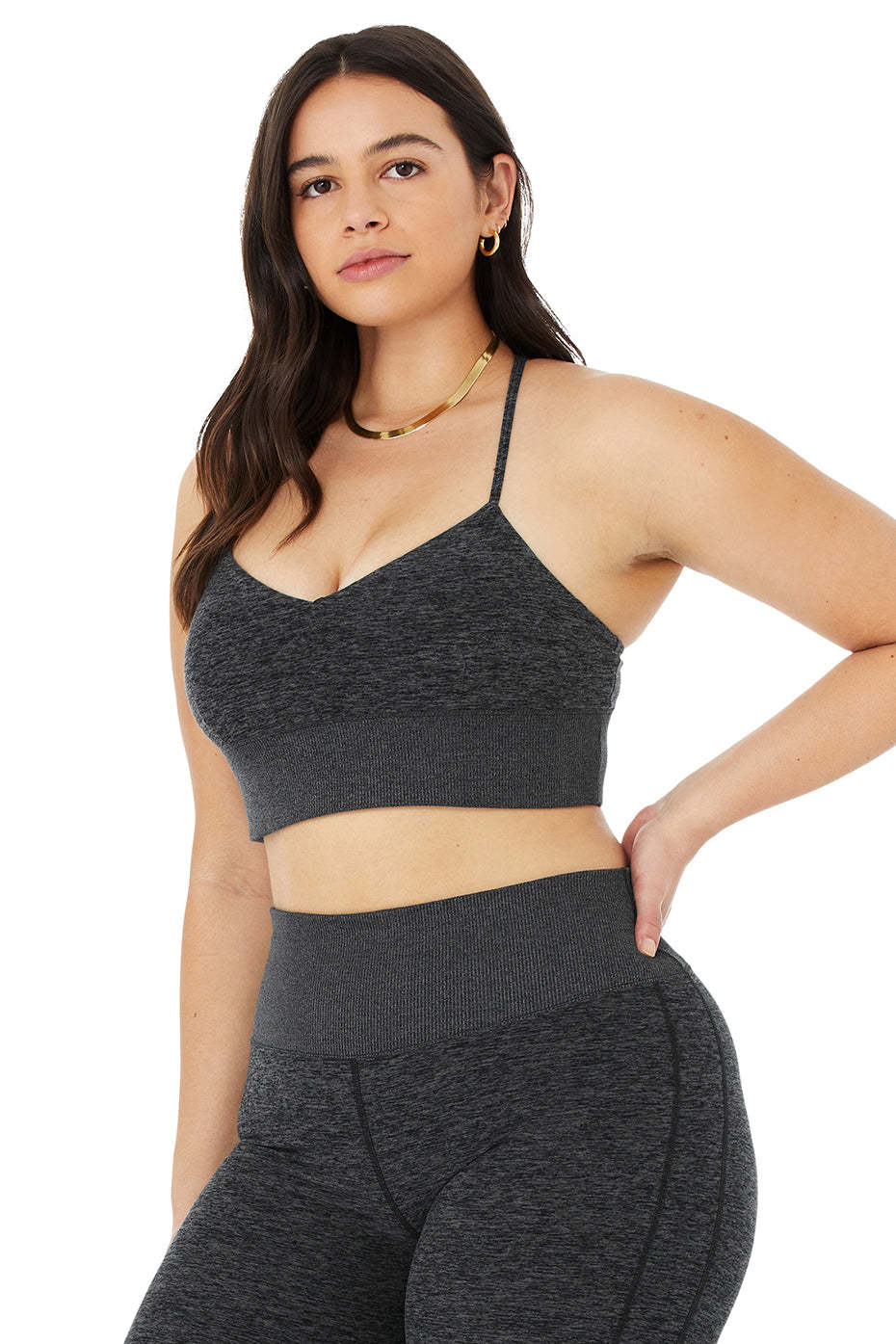 An update to our popular Lavish Bra, the athelosoft Lavish Bra comes in our signature brushed athelosoft fabric with moisture-wicking properties and 4-way stretch. It has a low V-neck and a sweet strappy back. A ribbed chest band keeps it super comfy and perfectly snug. We love it for practice or a sporty street look.