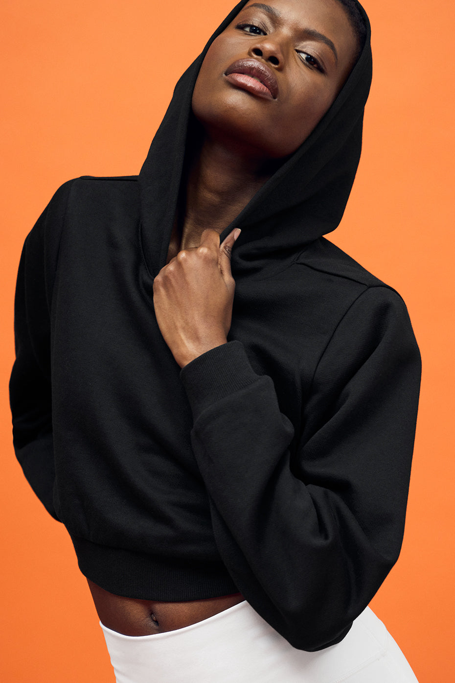 The Cropped Headliner Shoulder Pad Hoodie keeps things luxe even on the most casual days. Structured shoulder pads give this hoodie an elevated feel while ultra-cozy brushed fleece fabric keeps out the chill. Pair it with any legging or sweat pant for an epic, off-duty look.